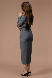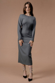 Платье женское прилегающего силуэта,длиной миди из ткани однотон,без подкладки.Со сборкой по области талии по боковым швам.Отрезное по линии талии.Рукав ашечного типа,по ЗП молния в среднем шве ,и высокая шлица. Длина платья 119 см, ширина уровне глубины проймы 45,47,49,51 см(42,44,46,48рр.) ширина по талии 34,36,38,40 см (42,44,46,48рр), ширина по бедрам 47,49,51,53 см соответственно. Длина рукава 61,5 см.