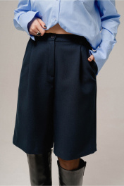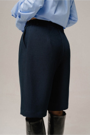 Шорты молодежные из костюмной ткани прямого расширенного силуэта,на притачном поясе прямого силуэта, с наклонными карманами и застежкой "гульфик" по переду, и эластичной тесьмой по спинке пояса. Длина по колено. Длина по боковому шву 55 см, ширина по талии 33,35,37 см (42,44,46рр) ширина по бедрам 55,57,59см соответственно