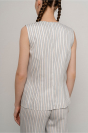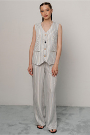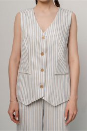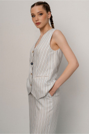Жилет женский полуприлегающего силуэта на подкладке из ткани полоса с центральной застежкой по переду на 4 петель 4 пуговиц.Карманы по переду в рамку,горловина Vобразной формы без воротника. Спинка со средним швом со шлицей. Длина 57,5 см. ширина изделия на уровне глубины проймы 46,48,50,52см (42,44,46,48рр) ширина по линии талии 43,45,47,49см соответственно, ширина по бедрам 50,52,54,56 см.