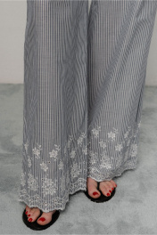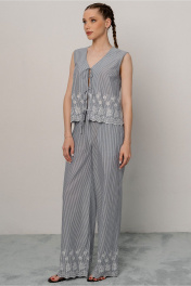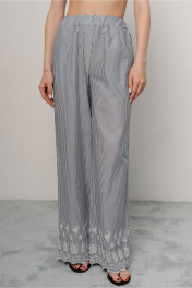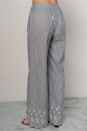 Брюки молодежные, из ткани хлопок с купонной вышивкой по низу ,прямого силуэта, на притачном поясе, с эластичной тесьмой внутри.Карманы по бокам ,с иммитацией застежки гульфиком.По ЗП- 2 вытачки талиевые Длина по боковому шву 104см, ширина по талии в стянутом виде 33,35,37см (42,44,46рр) ширина по бедрам 53,55,57 см соответственно