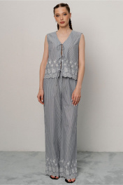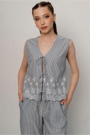 Жилет ткани в полоску с купонной вышивкой прямого силуэта,с завязками по переду без рукавов с вышивкой по низу изделия. Длина 51 см, ширина по линии груди 47,49,51 см. (42,44,46рр) ширина по талии 46,48,50см ширина по линии низа 48,50,52см соответственно.