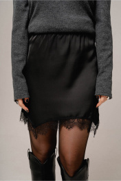 Юбка женская прямого силуэта,с фигурной линией низа,без застежки,из дабл шелк однотон,с эластичной тесьмой по верху шириной 1 см. По низу изделия пратачано кружево мини Длина по переду с кружевом -44 см,длина по углам юбки-51 см ширина по талии в стянутом виде 33,35,37см (42,44,46рр) , ширина по бедрам 51,53 ,55см соответственно