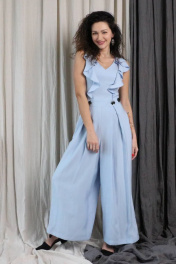 Комбинезон женский, повседневно-нарядный, прилегающего силуэта. Комбинезон отрезной по линии талии, со вставленным двойным поясом. На боковых швах на линии бедра расположены прорезные карманы. Перед с рельефами проходящими через центр груди с вставленной оборкой до линии талии. Спинка со средним швом в котором обработана застежка на потайную тесьму - молнию. Верх комбинезона обтачной ОГ 92 см в 46 р ОТ 80 см в 46 р ОБ брюки свободного кроя Длина изделия: в 46 р по 150 см Глубина выреза: 22 см