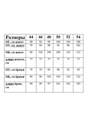 Комплект двухпредметный, повседневный состоящий из полуприлегающего жилета и брюк. В жакете воротник пиджачного типа с отворотом лацкана Карманы: жакет - передние, глубокие ; брюки – карман боковой, «обманка» с манжетом сзади Свойства ткани: легкий стрейч Жакет (в 48 размере): ОГ 96 см ОТ 94см Длина изделия 75,5 см Брюки (в 48 размере): ОТ 84 см ОБ 104 см Длина изделия 99 см