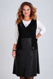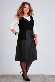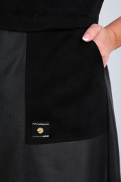 Сарафан женский, А-силуэта, из двух видов ткани. Верхняя часть сарафана и карманы из трикотажного полотна (замша), нижняя из искусственной кожи. Горловина V-образной формы с печатью. По линии талии сарафана складка, на нижней части спинки сборка. Длина сарафана по спинке – 108 см. р.54 – ПОГ 56 см, ПОБ 62 см, р.56 – ПОГ 58 см, ПОБ 64 см, р.58 – ПОГ 60 см, ПОБ 66 см.