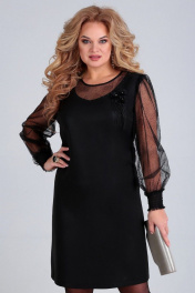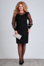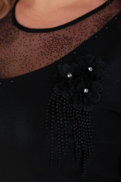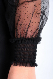 Платье нарядное, силуэта трапеция, из плательной ткани с отливом. Рукава и вставка из сетки в точку. По переду нагрудные вытачки, вырез горловины декорирован стразами. Рукава втачные, со сборками, внизу манжет прострочен венгеркой. По спинке талиевые вытачки, средний шов с молнией вверху. Длина платья по спинке – 98 см, рукава – 65 см. р.50 – ПОГ 53 см, ПОБ 56 см, р.52 – ПОГ 55 см, ПОБ 58 см, р.54 – ПОГ 57 см, ПОБ 60 см.