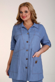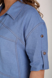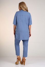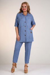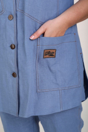 Комплект брючный 2-х предметный изготовлен из умягченного белорусского льна с эффектом мятости состоит из блузы и брюк. Блуза прямого силуэта. Горловина V-образной формы воротником рубашечного типа. Застежка центральная на петли и пуговицы. Рукава спущенные, длина – до локтя, регулируются патой и пуговицами. По переду обработана фигурная кокетка с отделочными, деталями и накладные карманы. Спинка разрезная на кокетке со средним швом и рельефами. По боковым швам обработаны разрезы. Брюки средней посадки, пояс притачной на резинке. По боковым швам обработаны подрезные детали и карманы. Костюм дополнен нашивкой и отделочными строчками. Длина блузы по спинке – 83 см., рукава – 24 см. р.56 – ПОГ 62 см, ПОБ 66 см, р.58 – ПОГ 64 см, ПОБ 68 см, р.60 – ПОГ 66 см, ПОБ 70 см. Длина брюк по боковому шву – 93 см. р.56 – ПОБ 62 см, р.58 – ПОБ 64 см, р.60 – ПОБ 66 см.