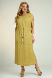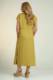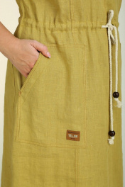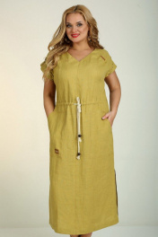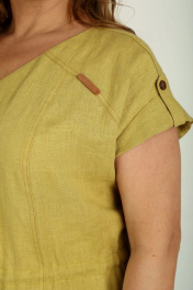 Платье женское, прямого силуэта изготовлено из натурального льна с эффектом мятости белорусского производства. Горловина V-образной формы. Рукав короткий, цельно-кроенный обработан манжетой и дополнен патой. Перед разрезной по центру с подрезными кокетками и рельефами. По линии талии обработана кулиса с вставленным в нее декоративным шнуром с наконечниками. Перед дополнен фигурными, накладными карманами с нашивкой. Спинка разрезная по центру на кокетке и рельефами от кокетки до низа изделия. Все швы отстрочены отделочной ниткой. По боковым швам обработаны разрезы. Длина платья по спинке – 126 см, р.52 – ПОГ 59 см, ПОБ 61 см, р.54 – ПОГ 61 см, ПОБ 63 см, р.56 – ПОГ 63 см, ПОБ 65 см.