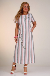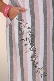 Платье женское изготовлено из натуральной ткани в полоску, прямого силуэта. Горловина круглой формы. Рукав втачной, короткий. Перед с нагрудными вытачками и подрезами. В боковых деталях имеются карманы. Спинка разрезная со средним швом, в котором обработан фигурный вырез и разрез по низу платья. Кокетки спинки выполнены по косой. Изделие дополнено вышивкой. Длина платья по спинке – 134 см, рукава – 20 см. р.54 – ПОГ 56 см, ПОБ 60 см, р.56 – ПОГ 58 см, ПОБ 62 см, р.58 – ПОГ 60 см, ПОБ 64 см.