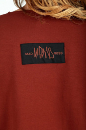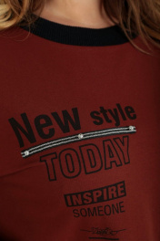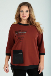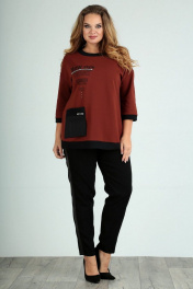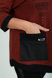 Блуза женская свободного силуэта, изготовлена из хлопкового трикотажного полотна. Горловина круглой формы обработана довязом. Рукав спущенный, длиной 7/8, по низу довяз. По переду нанесена печать, декорированная тесьмой и камнями. С правой стороны переда настрочен накладной отлетной карман с декоративным элементом. На спинке блузы нашивка с печатью. Низ изделия фигурный, обработан довязом. Длина блузы по спинке – 75 см, рукава – 33 см. р.52 – ПОГ 60 см, ПОБ 61 см, р.54 – ПОГ 62 см, ПОБ 63 см, р.56 – ПОГ 64 см, ПОБ 65 см, р.58 – ПОГ 66 см, ПОБ 67 см.