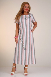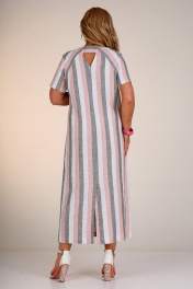 Платье женское изготовлено из натуральной ткани в полоску, прямого силуэта. Горловина круглой формы. Рукав втачной, короткий. Перед с нагрудными вытачками и подрезами. В боковых деталях имеются карманы. Спинка разрезная со средним швом, в котором обработан фигурный вырез и разрез по низу платья. Кокетки спинки выполнены по косой. Изделие дополнено вышивкой. Длина платья по спинке – 134 см, рукава – 20 см. р.52 – ПОГ 54 см, ПОБ 58 см, р.54 – ПОГ 56 см, ПОБ 60 см, р.56 – ПОГ 58 см, ПОБ 62 см, р.58 – ПОГ 60 см, ПОБ 64 см. р.60 – ПОГ 62 см, ПОБ 66 см. р.62 – ПОГ 64 см, ПОБ 68 см.
