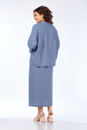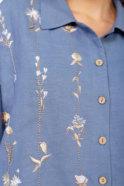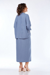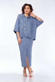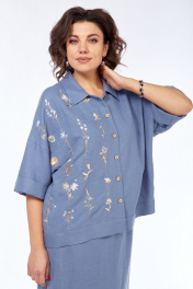 Костюм женский 2х-предметный, состоит из блузки и юбки, выполнен из натуральной ткани белорусского производства. Блузка свободного силуэта с воротником рубашечного типа и центральной застежкой на петли с пуговицами. Низ переда обработан притачной планкой. На спинке кокетка и складки. Рукава спущенные с отложными манжетами. Блузка декорирована вышивкой. Юбка прямого силуэта с притачным поясом, частично на эластичной тесьме. По переду обработаны боковые карманы, в центральном шве переда имеется шлица. Юбка на подкладке. Обращаем Ваше внимание, что цвет на экране может отличаться от реального. Состав: лен — 78%, вискоза — 22%. Описание Длина блузки по спинке — 63 см, длина плеча + рукав — 51 см. р.52 — ПОГ 68 см ПОБ 66 см, р.54 — ПОГ 70 см ПОБ 68 см, р.56 — ПОГ 72 см ПОБ 70 см, р.58 — ПОГ 74 см ПОБ 72 см. Длина юбки — 90 см. р.52 — ПОТ 38 см ПОБ 58 см, р.54 — ПОТ 40 см ПОБ 60 см, р.56 — ПОТ 42 см ПОБ 62 см, р.58 — ПОТ 44 см ПОБ 64 см.
