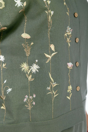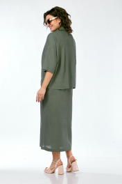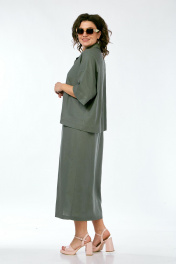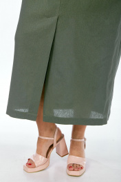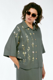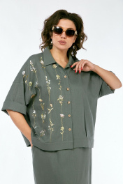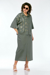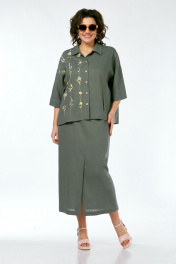 Костюм женский 2х-предметный, состоит из блузки и юбки, выполнен из натуральной ткани белорусского производства. Блузка свободного силуэта с воротником рубашечного типа и центральной застежкой на петли с пуговицами. Низ переда обработан притачной планкой. На спинке кокетка и складки. Рукава спущенные с отложными манжетами. Блузка декорирована вышивкой. Юбка прямого силуэта с притачным поясом, частично на эластичной тесьме. По переду обработаны боковые карманы, в центральном шве переда имеется шлица. Юбка на подкладке. Обращаем Ваше внимание, что цвет на экране может отличаться от реального. Состав: лен — 78%, вискоза — 22%. Описание Длина блузки по спинке — 63 см, длина плеча + рукав — 51 см. р.52 — ПОГ 68 см ПОБ 66 см, р.54 — ПОГ 70 см ПОБ 68 см, р.56 — ПОГ 72 см ПОБ 70 см, р.58 — ПОГ 74 см ПОБ 72 см. Длина юбки — 90 см. р.52 — ПОТ 38 см ПОБ 58 см, р.54 — ПОТ 40 см ПОБ 60 см, р.56 — ПОТ 42 см ПОБ 62 см, р.58 — ПОТ 44 см ПОБ 64 см.