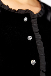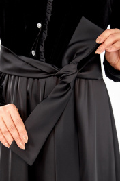 Платье женское нарядное А-силуэта, выполнено путем комбинирования тканей двух видов: бархата (верхняя часть) и атласа (нижняя часть). Платье отрезное по линии талии, нижняя часть по переду и спинке присобрана на сборку. Верхняя часть переда с центральной застежкой на петли и пуговицы. По горловине и краю борта обработана рюша. Рукава втачные на манжете. Платье дополнено съемным поясом из атласной ткани. Описание Длина платья по спинке — 125 см, длина плеча — 10 см, длина рукава — 62 см. р.52 — ПОГ 54 см ПОБ 64 см, р.54 — ПОГ 56 см ПОБ 66 см, р.56 — ПОГ 58 см ПОБ 68 см.