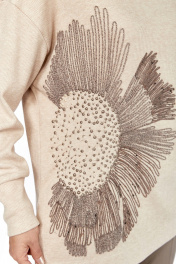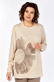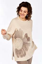 Джемпер женский, свободного кроя, изготовлен из трикотажного полотна. Горловина круглой формы. На полочке — вышивка. Спинка цельнокроенная. Рукава спущеные, с манжетам по низу. В боковых швах разрезы. Длина джемпера по спинке — 69 см, длина плеча + рукав — 73 см. р.52 — ПОГ 62 см ПОБ 60 см, р.54 — ПОГ 64 см ПОБ 62 см, р.56 — ПОГ 66 см ПОБ 64 см, р.58 — ПОГ 68 см ПОБ 66 см.