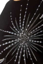 Платье женское, нарядное, изготовлено из трикотажного полотна. Горловина круглой формы, с кантом. На полочке дизайнерская вышивка. Спинка со средним швом и декоративной застежкой вверху. Рукава спущенные, длиной ¾, с сеткой по низу. Описание Длина платья по спинке — 107 см, длина плеча + рукав — 52 см. р.52 — ПОГ 67 см ПОБ 61 см, р.54 — ПОГ 69 см ПОБ 63 см, р.56 — ПОГ 71 см ПОБ 65 см, р.58 — ПОГ 73 см ПОБ 67 см.