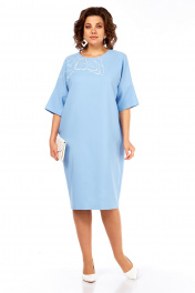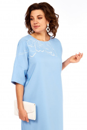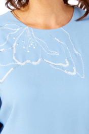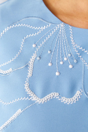 Платье женское, нарядное свободного силуэта. Выполнено из ткани костюмно-плательного ассортимента. Горловина округлой формы. Перед цельнокроеный дополнен дизайнерской вышивкой. Спинка со средним швом в котором обработана застежка на навесную петлю и пуговицу. Рукав спущенный. Длина платья по спинке — 106 см, длина плеча + рукав — 45-47,5 см. р.52 — ПОГ 66 см ПОБ 60 см, р.54 — ПОГ 68 см ПОБ 62 см, р.56 — ПОГ 69 см ПОБ 64 см, р.58 — ПОГ 71 см ПОБ 66 см.