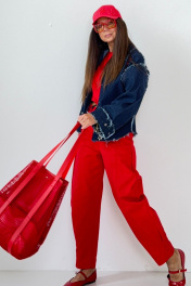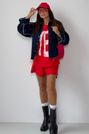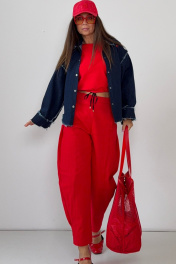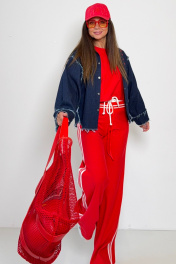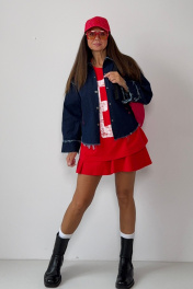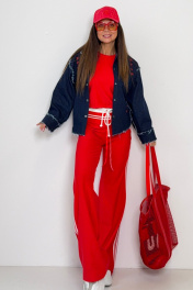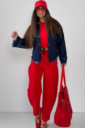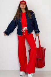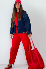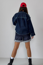 Жакет женский из джинсовой ткани с центральной бортовой застежкой на кнопки. Воротник стояче отложной. Рукав втачной спущеный. На деталях переда обработаны обработаны прорезные карманы с листочкой. Спинка с притачной кокеткой.