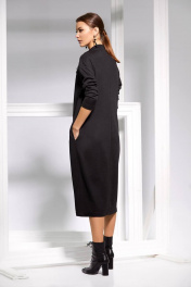 Платье прямого кроя из мягкого трикотажного полотна с цельнокроеным воротником-стойкой и спущенной линией плеча. Декорировано съемной авторской брошью ручной работы.