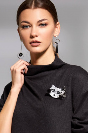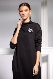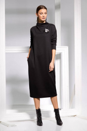 Платье прямого кроя из мягкого трикотажного полотна с цельнокроеным воротником-стойкой и спущенной линией плеча. Декорировано съемной авторской брошью ручной работы.