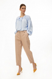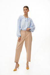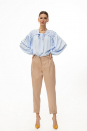 Брюки женские полуприлегающего силуэта, слегка зауженные к низу. По переду карманы с наклонным входом. Пояс притачной, по спинке пояса резинка, слева на шлевке расположен декор в виде металлического украшения. Застежка обработана на кнопку и молнию. Сзади расположены накладные карманы. Брюки отстрочены отделочными строчками. По низу брюки асимметричны, перед короче. Манжета передней части на резинке. Длина изделия по боковому шву 96 см.