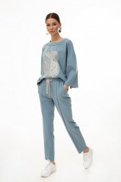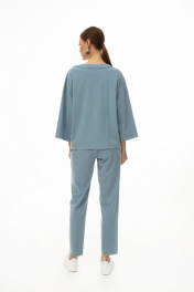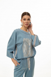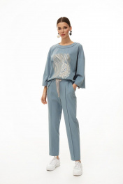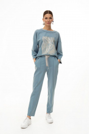 Костюм женский состоящий из джемпера и брюк. Джемпер прямого силуэта. Перед цельнокроенный, декорирован авторским принтом. Плечо спущено. Рукав одношовный, длинный. На боковой шов и шов рукава настрочена декоративная тесьма. Горловина округлой формы, обработана обтачкой «на лицо». Брюки полуприлегающего силуэта. Пояс притачной, частично на эластичной резинке, с декоративной шнуровкой. По переду отстрочены стрелки. В боковых швах расположены карманы с отрезным бочком. Низ с широкой подгибкой. Длина джемпера по спинке 62 см.Длина рукава 59 см. Длина брюк по боковому шву 102,5 см.
