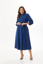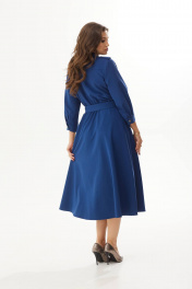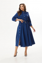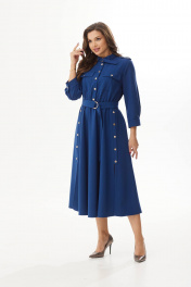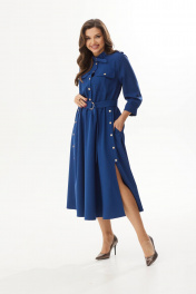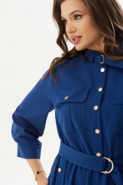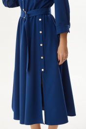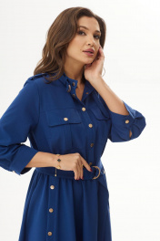 Платье женское полуприлегающего силуэта, отрезное по линии талии. По переду лифа застежка притачными планками на кнопки, накладные карманы с клапаном, застегивающиеся на кнопку. Горловина округлой формы, обработана стойкой со шлевками, в которых расположен деоративный поясок с полукольцами. На плечевых швах расположены декоративные паты с кнопкой. Рукав ¾, одношовный, с притачной манжетой. По переду юбки два разреза с планками, застегивающимися на кнопки. Платье комплектуется съемным поясом с полукольцами, выполненным из основной ткани. Декоративные элементы и фурнитура могут отличаться от заявленных на фото. Длина изделия по спинке 119 см. Длина рукава от горловины 49 см.