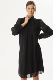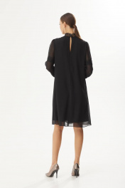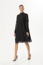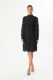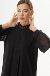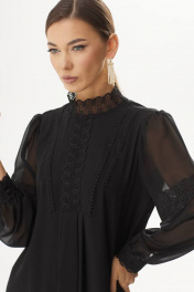 Платье женское А-образного силуэта, двухслойное, нижний слой из ткани-компаньона. По переду платья декоративные складки, верх декорирован кружевом. Рукав втачной длинный, декорирован кружевом в области предплечья, по низу обработан притачной манжетой с кружевом с застежкой на пуговицы и навесные петли. Спинка со средним швом. Горловина округлой формы со стойкой из кружева. Декоративные элементы и фурнитура могут отличаться от заявленных на фото. Длина изделия 97 см. Длина рукава 65 см.