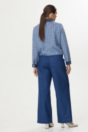 Комплект женский состоящий из жакета на подкладке и брюк. Жакет прямого силуэта, с центральной сквозной застежкой на петли и пуговицы, выполнен из основной ткани. Карманы, клапаны, манжеты, воротник, планка и пояс выполнены из ткани-компаньона. По переду настрочены накладные карманы с клапаном, застегивающиеся на петлю и пуговицу. Воротник рубашечного типа с отрезной стойкой. Рукав длинный, двухшовный, по низу обработан притачной манжетой, застегивающейся на петлю и пуговицу. Брюки женские, расширенные. По переду обработана застежка на молнию, обработаны карманы с наклонным входом. На задних половинках брюк застрочены вытачки, настрочены фигурные карманы. Верх обработан широким притачным поясом (частично на резинке), застегивающимся на петлю и пуговицу. Декоративные элементы и фурнитура могут отличаться от заявленных на фото. Длина жакета по спинке от плеча 59 см, длина брюк по боковому шву 107 см.