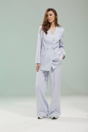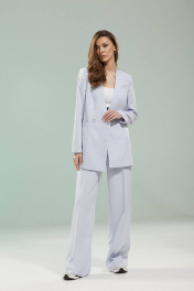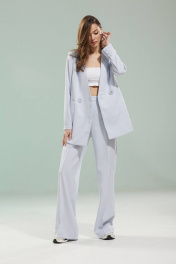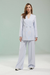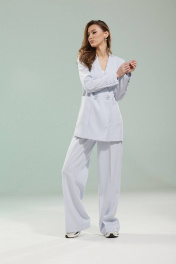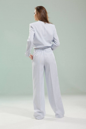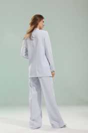 Костюм женский прямого силуэта, состоящий из жакета на подкладке по переду и брюк. Жакет двубортный с центральной застежкой на 2 петли и 2 пуговицы, с воротником-стойкой. По переду обработаны рельефы, карманы с листочкой. Спинка разрезная. Рукав длинный, двухшовный, с имитацией шлицы декорированной пуговицами. Брюки женские, расширенные. По переду обработана застежка на молнию, обработаны карманы с наклонным входом, заутюжены стрелки. На задних половинках брюк застрочены вытачки, заутюжены стрелки. Верх обработан широким притачным поясом (частично на резинке), застегивающимся на петлю и пуговицу.
