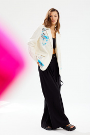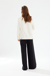 Жакет женский однобортный прямого силуэта, с застежкой на петли-пуговицы. Перед декорирован авторской печатью; с вытачками, на левой части переда сверху обработана листочка, по низу функциональные прорезные карманы в рамку с клапаном. Спинка разрезная с отделочными строчками; по низу притачная планка с патами, застегивающимися на кнопки. Воротник пиджачного типа. Рукав длинный, одношовный, по низу обработан притачной манжетой с застежкой на кнопку. Декоративные элементы и фурнитура могут отличаться от заявленных на фото. Цвет материала может отличаться по тону в зависимости от настроек вашего устройства! Жакет молочного цвета. Длина жакета по спинке 68 см, длина рукава 63 см.