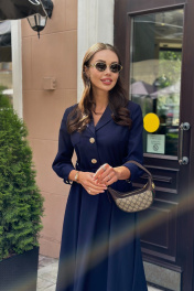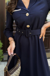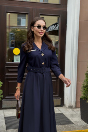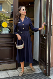 Платье женское, полуприлегающего силуэта, отрезное по линии талии. Перед лифа с центральной бортовой застежкой на петли и пуговицы, с нагрудными вытачками и накладным карманом справа. Карман декорирован отделочной тесьмой и металлической нашивкой. Спинка лифа со средним швом. В области талии платье собрано на резинку. Рукав одношовный, длиной ¾. По низу заложены складки, обработан притачной манжетой, застегивающейся на петлю и пуговицу. Горловина V-образной формы, обработана воротником с отрезной стойкой. Воротник и манжеты декорированы тесьмой. Платье комплектуется съемным ремнём.Цвет материала может отличаться по тону в зависимости от настроек вашего монитора! Длина изделия по спинке 120 см, длина рукава 50,5 см.
