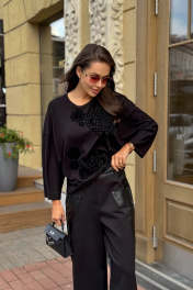 Брюки женские, прямые. Брюки выполнены из трикотажного полотна. Перед декорирован накладными деталями из ткани-компаньона (эко-кожа), застрочены вытачки, обработаны боковые карманы с фигурным входом, обработана застежка на молнию. Задние половинки брюк с кокеткой и фигурными накладными карманами из ткани-компаньона. Верх обработан притачным поясом, застегивающимся на кнопку. Сзади пояс резинкой. Декоративные элементы и фурнитура могут отличаться от заявленных на фото. Цвет материала может отличаться по тону в зависимости от настроек вашего монитора! Длина изделия по боковому шву 113 см. Ширина по линии бедер: 44р. - 100см, 46р. - 104 см, 48р. - 108см, 50р. - 112 см, 52р. - 116см, 54р. - 120см.