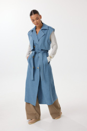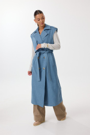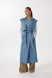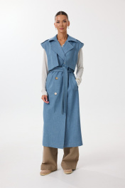 Жилет удлиненный прямого силуэта с центральной двубортной застежкой на петли и пуговицы. По переду обработаны нагрудные вытачки, карманы с наклонным входом с листочкой. Спинка со средним швом, в котором обработана шлица. По спинке и переду выполнены отлетные кокетки с отделочными строчками контрастного цвета. В области талии расположены широкие шлевки для пояса из основной ткани, которым комплектуется жилет. По горловине воротник с отрезной стойкой. В области плечевых швов расположены декоративные паты с пуговицами. Все отделочные строчки выполнены гарусной нитью контрастного цвета. Декоративные элементы и фурнитура могут отличаться от заявленных на фото. Цвет материала может отличаться по тону в зависимости от настроек вашего монитора! Длина изделия по спинке 119,5 см.