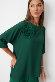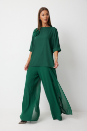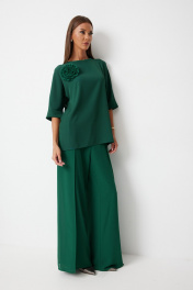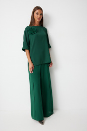 Костюм состоит из блузы и брюк. Блуза женская прямого силуэта закрывающая линию паха с цельнокроеными рукавами. К блузке прилагается съёмный декор – цветок. По боковым швам располагаются разрезы. Спинка с центральным швом и застежкой на навесную петлю и пуговицу. Горловина обработана косой бейкой. Рукав до локтя, низ рукава обработан отрезной отворачивающейся манжетой, закрепленной по швам. Низ блузки обработан швом «в подгибку». Брюки прямого силуэта, выполнены из шифоновой ткани на подкладке полной длинны. Боковой шов брюк открыт. Синка брюк заходит на перед по верхней части. Подкладка из не просвещающейся креповой ткани. Верх брюк обработан отрезным поясом. Центральная часть пояса без резинки, остальной пояс на резинке. Низ брюк обработан швом « в подгибку». Цвет материала может отличаться по тону в зависимости от настроек вашего монитора!. Длина блузы по спинке 50 р. - 68 см, 56 р. - 69 см, Длина брюк по боковому шву 110 см.