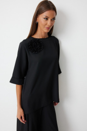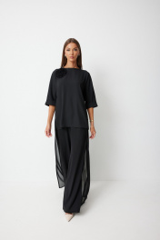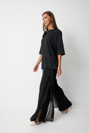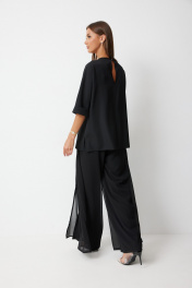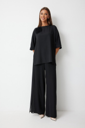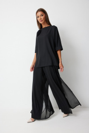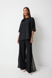 Костюм состоит из блузы и брюк. Блуза женская прямого силуэта закрывающая линию паха с цельнокроеными рукавами. К блузке прилагается съёмный декор – цветок. По боковым швам располагаются разрезы. Спинка с центральным швом и застежкой на навесную петлю и пуговицу. Горловина обработана косой бейкой. Рукав до локтя, низ рукава обработан отрезной отворачивающейся манжетой, закрепленной по швам. Низ блузки обработан швом «в подгибку». Брюки прямого силуэта, выполнены из шифоновой ткани на подкладке полной длинны. Боковой шов брюк открыт. Синка брюк заходит на перед по верхней части. Подкладка из не просвещающейся креповой ткани. Верх брюк обработан отрезным поясом. Центральная часть пояса без резинки, остальной пояс на резинке. Низ брюк обработан швом « в подгибку». Цвет материала может отличаться по тону в зависимости от настроек вашего монитора!. Длина блузы по спинке 50 р. - 68 см, 56 р. - 69 см, Длина брюк по боковому шву 110 см.