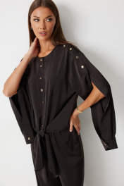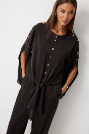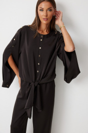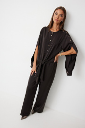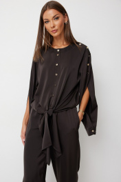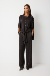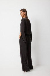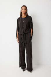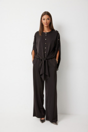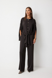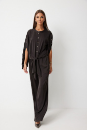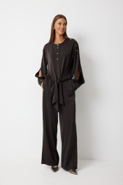 Костюм женский состоящий из блузки и брюк. Блузка прямого силуэта с втачными фантазийными рукавами и разноуровневой линией низа. Блузка по переду предполагает завязку полочек и застегивается на петли пуговицы. Спинка блузки обработана резинкой по нижнему срезу. Горловина блузки обработана отрезной стойкой. Рукав с плечевым швом застегивается на декоративные пуговицы. По низу рукава расположена складка, рукав обработан притачной манжетой застегивающейся на петлю и пуговицу. Брюки прямого силуэта полной длинны В боковых швах брюк обработаны карманы. Верх брюк обработан отрезным поясом «на резинке». Цвет материала может отличаться по тону в зависимости от настроек вашего монитора