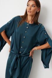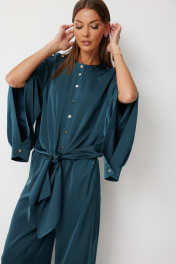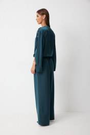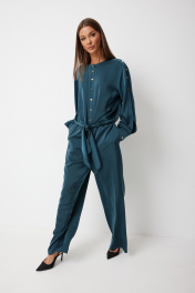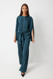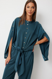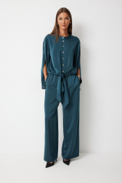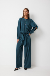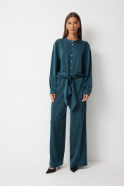 Костюм женский состоящий из блузки и брюк. Блузка прямого силуэта с втачными фантазийными рукавами и разноуровневой линией низа. Блузка по переду предполагает завязку полочек и застегивается на петли пуговицы. Спинка блузки обработана резинкой по нижнему срезу. Горловина блузки обработана отрезной стойкой. Рукав с плечевым швом застегивается на декоративные пуговицы. По низу рукава расположена складка, рукав обработан притачной манжетой застегивающейся на петлю и пуговицу. Брюки прямого силуэта полной длинны В боковых швах брюк обработаны карманы. Верх брюк обработан отрезным поясом «на резинке». Цвет материала может отличаться по тону в зависимости от настроек вашего монитора