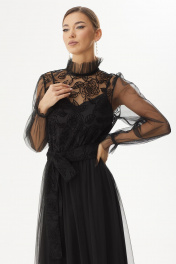 Платье двухслойное полуприлегающего силуэта, отрезное по линии талии. Верхний лиф выполнен из фатина с флоком. Перед и спинка цельнокроеные. В области горловины обработана застежка-капелька на навесную петельку и пуговицу. Нижняя юбка прямая, верхняя юбка собрана по линии талии. Рукав длинный, втачной, по низу оборка, на запястье просборен на резинку. Горловина округлой формы, декорирована тесьмой. В комплекте съемный пояс. Платье двухслойное полуприлегающего силуэта, отрезное по линии талии. Верхний лиф выполнен из фатина с флоком. Перед и спинка цельнокроеные. В области горловины обработана застежка-капелька на навесную петельку и пуговицу. Нижняя юбка прямая, верхняя юбка собрана по линии талии. Рукав длинный, втачной, по низу оборка, на запястье просборен на резинку. Горловина округлой формы, декорирована тесьмой. В комплекте съемный пояс. Длина платья по спинке88 см, длина нижнего платья 70 см.