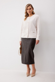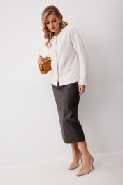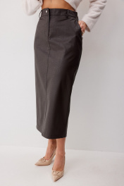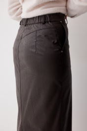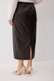 Юбка-карандаш женская из искусственной кожи. Длина юбки до середины икры. По переду в юбке обработаны карманы с отрезным бочком, по концам кармана установлены хольнитены. Перед юбки с центральным швом, в котором обработан гульфик с застежкой – молнией. Спинка юбки со средним швом в котором располагается разрез. Верх спинки юбки с отрезной фигурной кокеткой и вытачками. Верхний срез юбки обработан отрезным поясом, с резинкой по спинке и шлевками. Пояс застегивается на кнопку. Длина юбки по боковому шву 90 см.