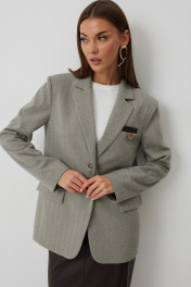Жакет женский однобортный на подкладке прямого силуэта из трикотажной ткани. На передних частях жакета отрезной бочок с нагрудными вытачками. Обработаны прорезные карманы «в рамку» с клапаном. На левой части переда обработан карман с листочкой и декоративной пришивной деталью. Листочка, рамки кармана и нижний воротник выполнены из искусственной кожи. Спинка со шлицей в среднем шве. Рукав втачной двухшовный. Горловина обработана втачным воротником с отложными лацканами. Низ передних частей имеет закругленную форму. Жакет застегивается н а 2 декоративный пуговицы. Длина жакета по спинке 71 см см, Длина рукава 64 см.