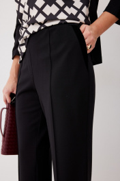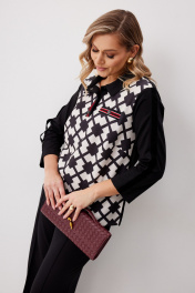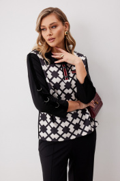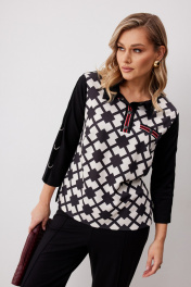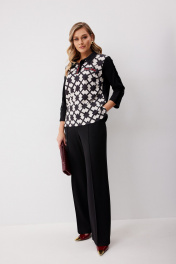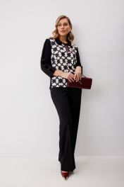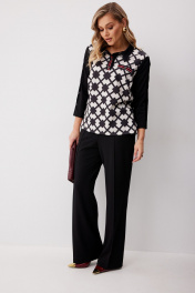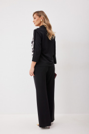 Костюм состоящий из блузы с брюками. Блуза по типу «поло» из трикотажной ткани длиной до середины бедра с застежкой до линии груди. Втачные планки обработаны декоративной тесьмой и застегиваются на кнопки. Перед выполнен из ткани с принтом. По левой половинке выполнен карман обманка с листочкой с декоративной тесьмой и кнопкой. Спинка прямая. Горловина обработана втачным воротником. Рукав ¾ прямой одношовный. На рукавах настрочена декоративная бархатная лента, на правом рукаве с тремя полукольцами. Брюки прямого силуэта из трикотажной ткани с поясом на частичной резинке. По передним половинкам брюк застрочены стрелки и выполнены наклонные карманы с отрезным бочком. Верх кармана декорирован бархатной тесьмой. По передним половинкам отстрочен гульфик (имитация). По спинке брюк застрочены вытачки. Длина спинки изделия 63,5 см, длина руква 50 см, длина брюк по боковому шву с поясом 115 см.