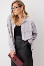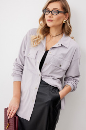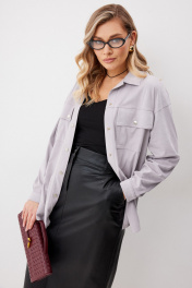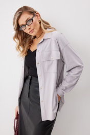 Блузка женская прямого силуэта из замшевой ткани длиной за линию бедер. По переду блузки отрезные кокетки и нагрудные накладные карманы с клапаном, застегивающиеся на кнопку. Спинка с отрезной кокеткой и встречной складкой. Линия плеча спущена. Рукав рубашечный втачной по низу с 2 –мя складками и отрезной манжетой, застегивающейся на кнопку. Воротник втачной рубашечный. Линия низа имеет фигурную форму. Воротник, кокетки, карманы, линия проймы отстрочены отделочными строчками. Застежка на кнопки центральная. Длина спинки изделия 73,5 см, длина рукава от горловины 77,5 см.