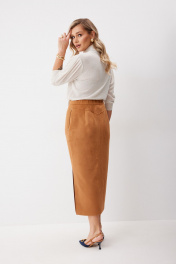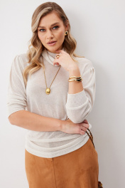 Блуза женская прямого силуэта из трикотажной ткани длиной ниже линии бедра. Горловина обработана отложной стойкой. Рукав ¾ втачной одношовный. По верху рукава заложены складки, по низу рукава притачная манжета. Длина спинки изделия 70,5 см, длина на рукава 48 см.