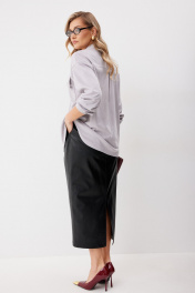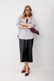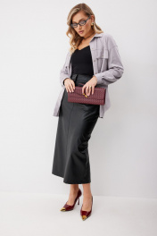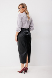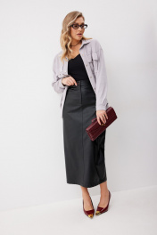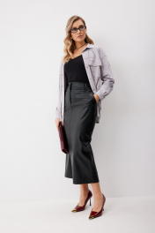 Юбка-карандаш женская из искусственной кожи. Длина юбки до середины икры. По переду в юбке обработаны карманы с отрезным бочком, по концам кармана установлены хольнитены. Перед юбки с центральным швом, в котором обработан гульфик с застежкой – молнией. Спинка юбки со средним швом в котором располагается разрез. Верх спинки юбки с отрезной фигурной кокеткой и вытачками. Верхний срез юбки обработан отрезным поясом, с резинкой по спинке и шлевками. Пояс застегивается на кнопку. Длина по боковому шву 90см.