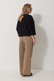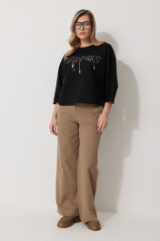 Джемпер женский прямого силуэта «летучая мышь» с округлой горловиной и спущенной линией плеча. По переду в области груди расположена авторская вышивка с пришивным декором. Рукав двухшовный 3/4 соединен с отрезным бочком полочки и спинки.