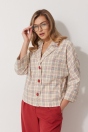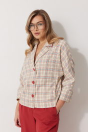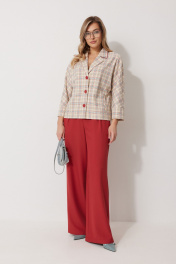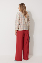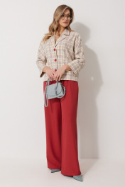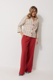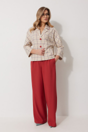 Костюм женский, состоящий из жакета и брюк. Жакет без подкладки, кроя «летучая мышь», с центральной однобортной застежкой на петли и пуговицы. По переду обработаны вертикальные прорезные карманы с листочкой. Спинка цельнокроеная. Горловина V-образной формы, обработана воротником пиджачного типа с контрастным кантом. Рукав 7/8, по низу обработан широкой притачной манжетой. Брюки женские, прямого силуэта. По переду заложены складки и обработана застежка на молнию. Карманы расположены в боковом шве. На задних половинках брюк застрочены вытачки. Верх обработан широким притачным поясом (частично на резинке), застегивающимся на петлю и пуговицу.