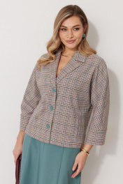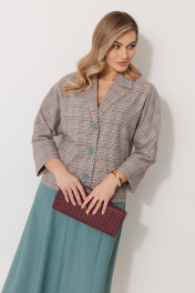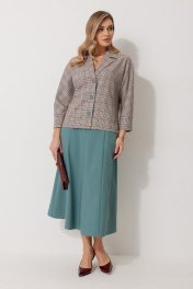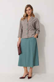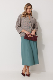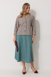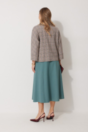 Костюм женский, состоящий из жакета и юбки. Жакет без подкладки, кроя «летучая мышь», с центральной однобортной застежкой на петли и контрастные пуговицы. По переду обработаны вертикальные прорезные карманы с листочкой. Спинка цельнокроеная. Горловина V-образной формы, обработана воротником пиджачного типа с контрастным кантом. Рукав 7/8, по низу обработан широкой притачной манжетой. Юбка женская А – силуэта длиной до середины икры. Перед юбки состоит из 4 клиньев. Вверху передней части юбки располагается карман с отрезным бочком. Спинка юбки состоит из 4 клиньев. По среднему шву юбки находится застежка – молния. Верхний срез юбки обработан обтачкой.