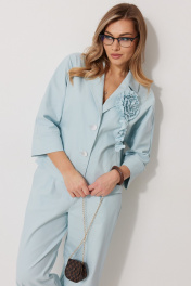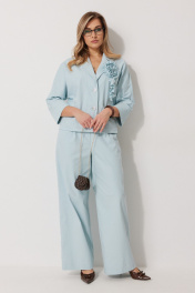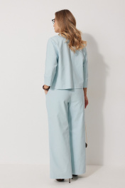 Костюм женский, состоящий из жакета и брюк. Жакет без подкладки, кроя «летучая мышь», с центральной однобортной застежкой на петли и пуговицы. По переду обработаны вертикальные прорезные карманы с листочкой. Спинка цельнокроеная, слева расположен декор в виде авторской броши. Горловина V-образной формы, обработана воротником пиджачного типа. Рукав 7/8, по низу обработан широкой притачной манжетой. Брюки женские, расширенные. По переду обработана застежка на молнию, обработаны карманы с наклонным входом. На задних половинках брюк застрочены вытачки. Верх обработан широким притачным поясом (частично на резинке), застегивающимся на петлю и пуговицу.