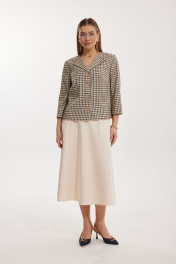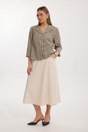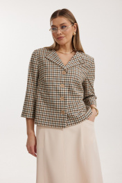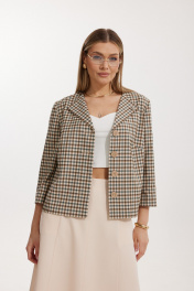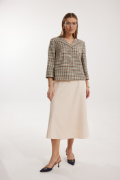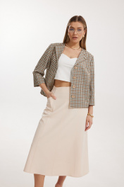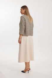 Костюм женский, состоящий из жакета в клетку и однотонной юбки. Жакет на подкладке, с рукавом и центральной однобортной застежкой на петли и декоративные пуговицы. Длина жакета до линии бедра. По переду обработаны наклонные вытачки. Спинка со средним швом. Горловина V-образной формы с отворачивающимися лацканами. Линия горловины обработана обтачкой. Рукав втачной, двухшовный ¾ длины. Юбка на подкладке женская А – силуэта длиной до середины икры. Перед юбки состоит из 4 клиньев. Вверху передней части юбки располагается карман с отрезным бочком. Спинка юбки состоит из 4 клиньев. По среднему шву юбки находится застежка – молния. Верхний срез юбки обработан обтачкой